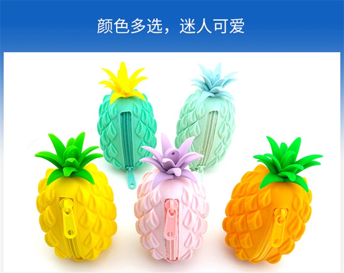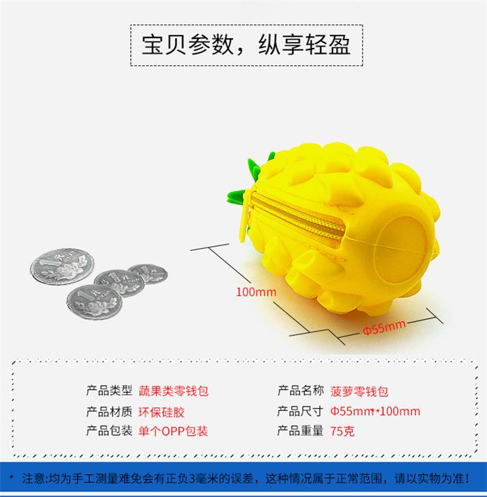 产品特点:此款仿真菠萝硅胶零钱包防水耐用抗老化,软硬适中有弹性,安全无异味,不易染脏可水洗;弹性、韧性好,撕裂强度高,平整度好,抗温强度高等。